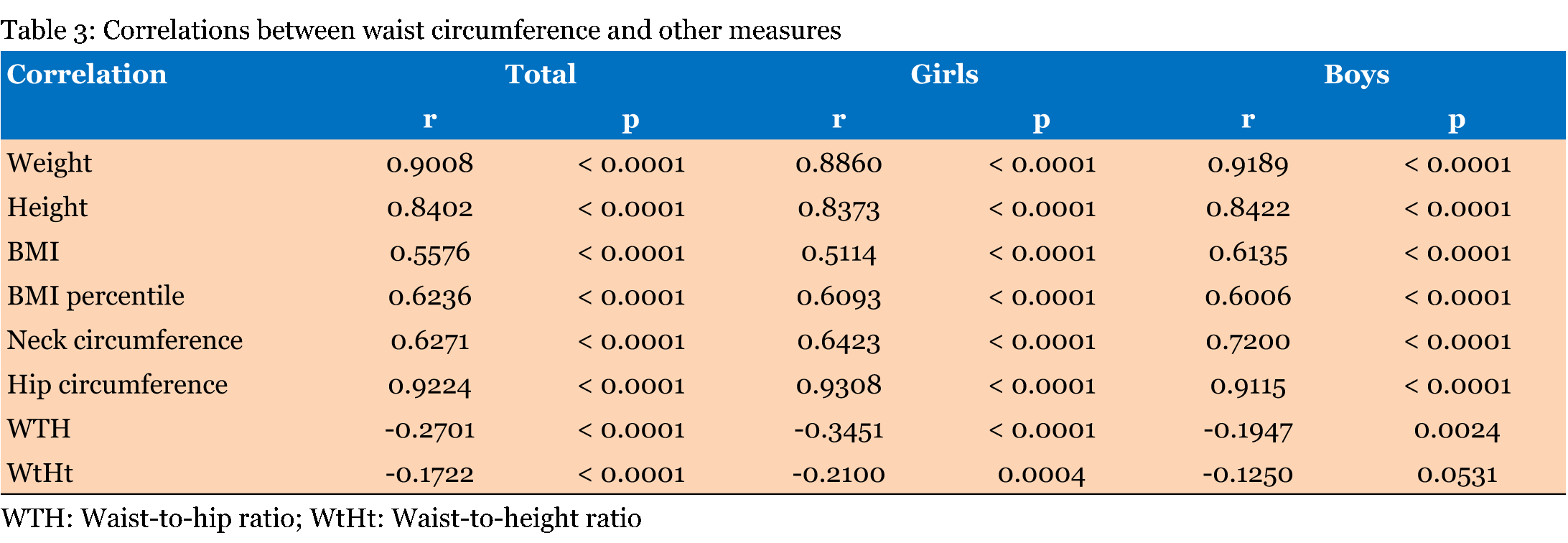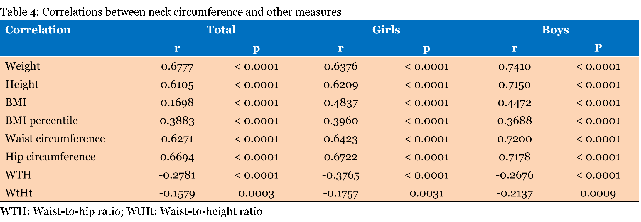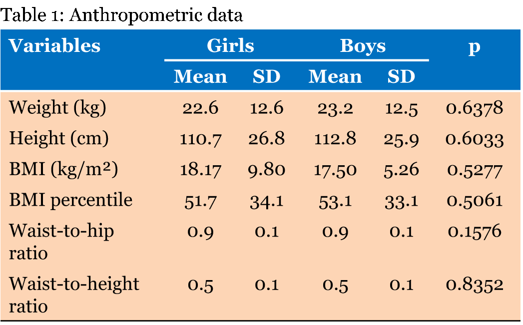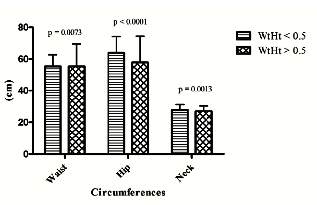 This cross-sectional study evaluated 522 children (282 girls and 240 boys) regarding age, weight, height, waist, hip and neck circumferences, WTH, and WtHt. Patients Measurements Standing height was measured without shoes with a stadiometer (Filizola, São Paulo, Brazil) and recorded to the nearest 0.5 cm. A non-elastic flexible measuring tape was used to measure waist, hip and neck circumferences. Measures were recorded to the nearest 0.1 cm. Waist circumference was measured at the mid-distance between the lower rib and the iliac crest. Neck circumference was measured just below the laryngeal prominence with the measuring tape applied perpendicular to the long axis of the neck. BMI was calculated by dividing total body weight (kg) to the squared standing height (m2). BMI percentile was calculated using the BMI percentile calculator for children and teenagers provided by the Centers for Disease Control and Prevention (CDC) website. WTH was calculated by dividing waist circumference (cm) to hip circumference (cm). WtHt ratio was calculated by dividing waist circumference (cm) to height (cm). Ethical Considerations Statistical Analysis The unpaired Student T-test was used to compare means between two groups and the Fisher's exact test analyzed categorical variables. The Kolmogorov-Smirnov test was used to analyze the residuals for normality. (When alpha = 0.05, data passes this normality test). Whenever data did not pass the normality test, the Mann-Whitney test was used to compare means between two groups. Relationships between two numeric variables were studied by linear regression and Pearson parametric correlation, except when data distribution was not normal and the Spearman nonparametric correlation was used. Nonparametric tests were also done in parallel with the parametric ones with confirmatory purposes. The statistical significance was set as 5%. The analysis were carried out using GraphPad Prism 5 for Windows (GraphPad Software, San Diego, California, USA), and Epi InfoTM 7 (Centers for Disease Control and Prevention, USA). | ||||||