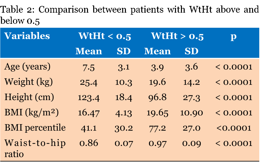The mean age of the present group of patients corresponded to 5.9±3.8 years. There was no difference between girls and boys regarding this variable (p = 0.8266). (Table 1) gives the anthropometric data obtained in the present study. The mean body weight was 22.8±12.5 kg. When data from girls and boys were compared, no difference was noticed regarding this variable (p = 0.6378). The mean height was 111.6±26.3 cm. No difference was detected when mean height of girls and boys was compared (p = 0.6033). BMI corresponded to 17.86±8.03 kg/m2 and, similarly to what was obtained for the comparisons regarding weight and height, no difference between data from girls and boys was obtained (p = 0.5277). Mean BMI percentile was calculated for patients aged two years or more and achieved 52.5±33.7. Based on the BMI percentile, patients were classified as underweight (BMI below the 5th percentile), healthy weight (5th up to the 85th percentile), overweight (85th to less than 95th percentile), and obese (equal to or greater than the 95th). Among the 419 children whose BMI percentile was evaluated, 37 were underweight, 277 had a healthy weight, 50 were overweight, and 55 were obese. Figure 1 exhibits the comparisons between the circumferences of girls and boys. Mean waist circumference achieved 55.4 ± 10.9 cm and no statistically significant differences were detected when girls and boys were compared (54.9 ± 10.4 vs 56.0 ± 11.4, respectively, p = 0.4921). Mean hip circumference in this sample corresponded to 61.1±13.9 cm (61.3±14.3 vs 60.9±13.5, respectively, p = 0.9732), while mean neck circumference was 27.6±3.4 cm (27.4±3.3 vs 27.8±3.5, respectively, p = 0.1125). Mean WTH corresponded to 0.92 ± 0.1; girls and boys did not differ significantly in this aspect either (p = 0.1576 – (Table 1)). Finally, mean WtHt achieved 0.5±0.1 (p = 0.8352 – (Table 1)). A WtHt above 0.5 was considered to be high and 44.1% of patients were classified as this. The prevalence of high WtHt was 43.6% in girls and 44.7% in boys. Table 2 gives the comparison between the anthropometric data from patients with high and normal WtHt. The mean age of patients with high WtHt was lower than those with normal WtHt (p < 0.0001). Mean body weight and height of patients with high WtHt were lower (p < 0.0001). On the other hand, mean BMI was higher in this group (p < 0.0001). Figure 2 exhibits the comparisons between the circumferences of patients with normal and high WtHt. Mean waist circumference was higher in those with WtHt above 0.5 (55.4±14.1 vs 55.4±7.3 cm, p = 0.0073), while hip and neck circumferences were lower (hip: 57.8 ± 16.5 vs 63.8±10.3, p < 0.0001, and neck: 27.1±3.4 vs 27.9±3.4 cm, p = 0.0013). WTH was higher in those with high WtHt (p < 0.0001). (Table 3) gives the correlations between waist circumference and other anthropometric measures. Weight, height, BMI, BMI percentile, neck and hip circumferences, WTH, and WtHt were significantly correlated with waist circumference. The only exception was the correlation between waist circumference and WtHt in boys for which the p-value approached statistical significance. This study also investigated the correlations between neck circumference and other anthropometric measures, which are summarized in (Table 4). Weight, height, BMI, BMI percentile, waist and hip circumferences, WTH, and WtHt were significantly correlated with neck circumference. | ||||||